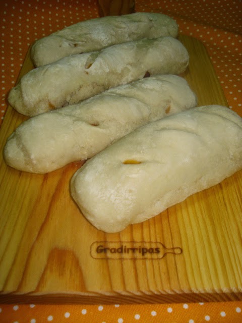 - Deite a massa numa bancada polvilhada com farinha e divida a massa em 6 parte ,estenda a massa em forma de retângulo e espalhe as rodelas de chouriço e coloque num tabuleiro de ir ao forno.Faça uns cortes na diagonal e deixe levedar mais 20 minut.num local morno.